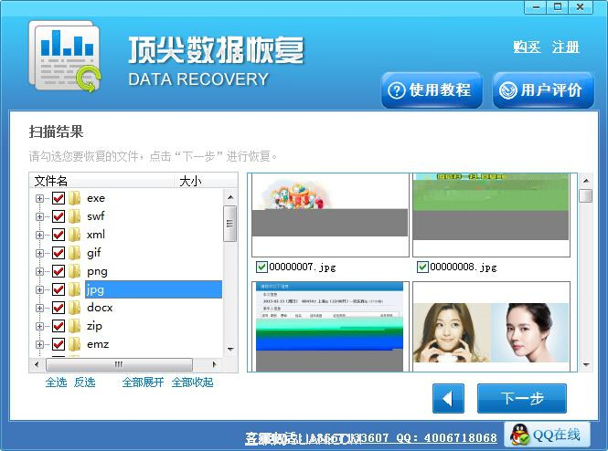 第四步:扫描完查找扫描结果,勾选需要恢复的文件,然后点击下一步。用户可以浏览扫描出来的文件,根据自己的需要有选择的恢复,提高恢复效率。