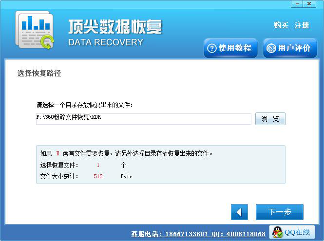 第五步:选择一个盘存放需要恢复出来的文件,然后单击下一步,静待恢复完成。这里要提醒大家,存放恢复文件的盘不能与文件原来所在盘相同,必须存在不同的盘中,以免数据被覆盖,影响恢复效果。