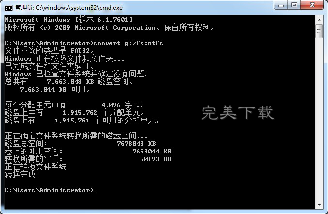 “convert X:/fs:ntfs”(不包括引号),其中X代表的就是我们需要转换的u盘目前所占用的盘符,输入完成后按下回车键就会开始进行u盘格式转换,如下图所示: