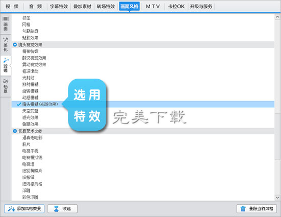 剪辑好视频后,在“画面风格”的“滤镜”一栏,双击“镜头模糊(光斑效果)”选项,在弹出的对话框中,根据个人的需要,设置模糊效果应用的时间段。