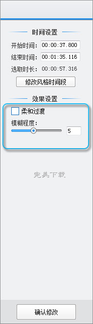 在风格列表右侧,可以对模糊效果进行“模糊程度”和“柔和过渡”等灵活的设置,调整后点击“确认修改”按钮即可。