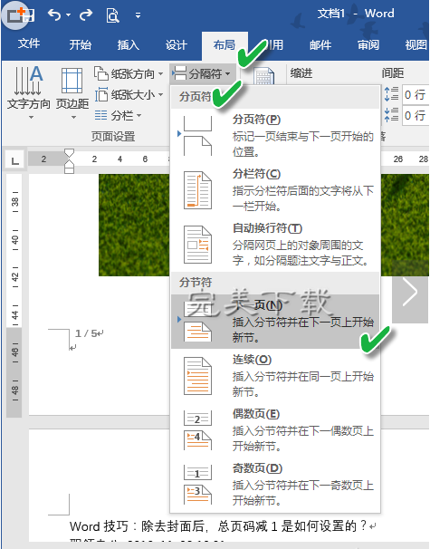 其实这个问题可以借助于“节”及其属性延续的设置来搞定。在上图的版面中,将光标打到封面图片之后,依次选择“布局→分隔符→分节符→下一页(插入分节符并在下一页上开始新节)”。