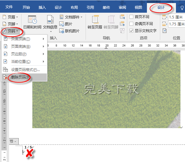之后,将光标打到封面的页脚处,依次点击“设计→页码→删除页码”。这样封面的页码就去除了。