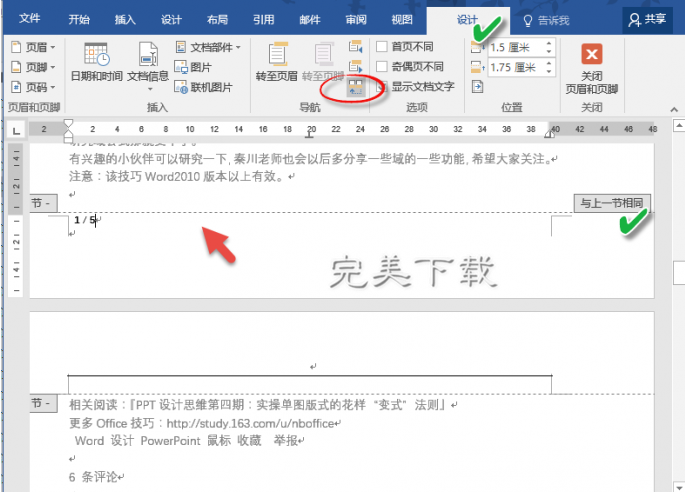 那么,封面下方难看的页码如何去除呢?这时不能贸然去第一页中删除页码,因为下一页的页眉页脚属性目前处于“与上一节相同”状态,若是删除了,则正文中的页码也没有了。这时需要将光标定位于第二页的页脚,然后通过“设计”菜单中的“链接到前一条页眉”按钮,将与前一页的页脚的属性关联“斩断”。