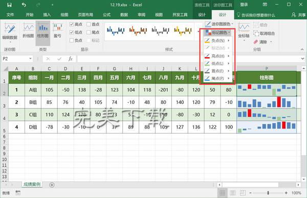 柱形图需要介绍的是【标记颜色】功能,按我们日常习惯,把【高点】设置为红色,把【低点】设置为绿色。从图中,我们就能一眼看出各组的最高、最低点分别在哪里了。