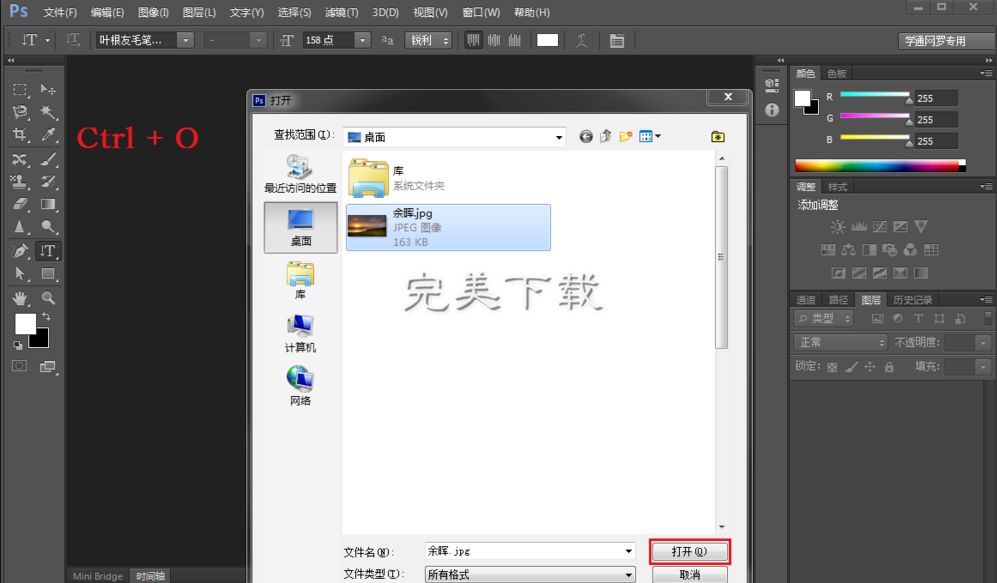 1、打开Ps后,按下Ctrl+O,选中待处理的图片并点击打开。