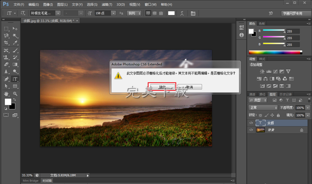 5、之后会弹出一个对话框,提示是否栅格化文字?,请选择确定。