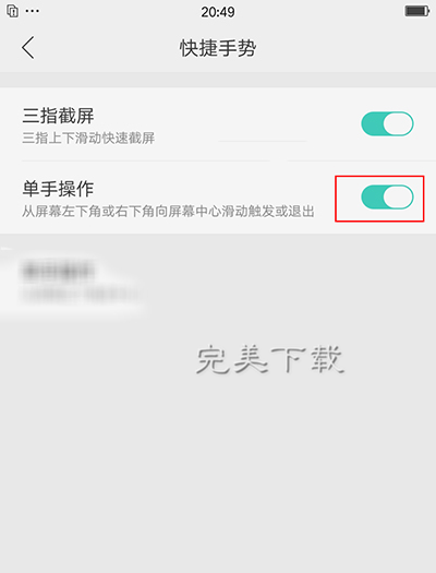 3、最后在快捷手势页面,找到并开启【单手操作】按钮开关即可,如下图所示:
