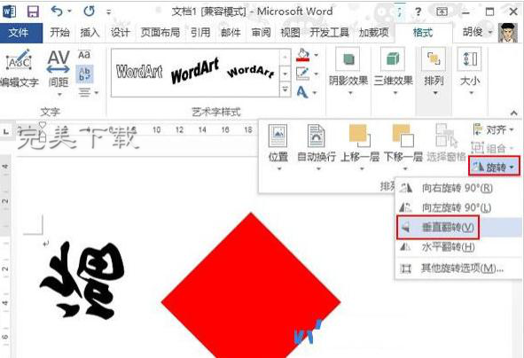 步骤6:在格式--排列--旋转选项中,将文字垂直翻转,形成倒立的样子。