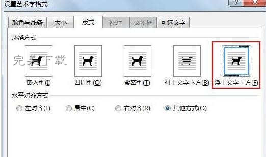 步骤5:右击文字,从右键菜单中选择设置艺术字格式,弹出对话框,选择浮于文字上方。