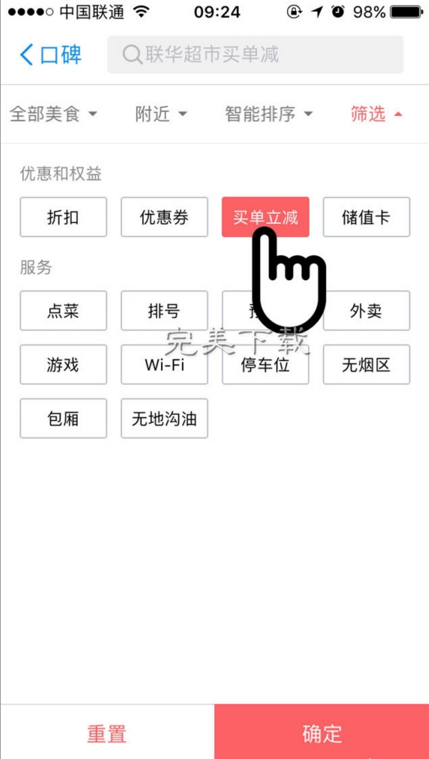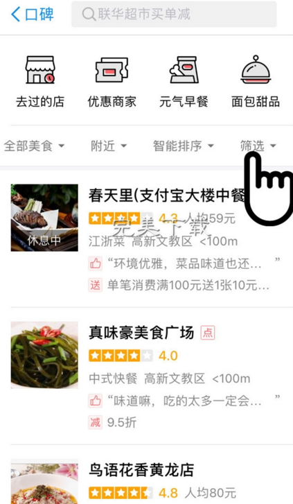 为了让消费者更快找到参与立减的商家,支付宝口碑频道特地上线了商店筛选功能。用户选择买单立减功能,口碑系统会根据用户所在的地理位置,推荐具有此项优惠的线下商家(具体见下图)。