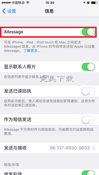 在设置界面下滑就可以找到【信息】,进入之后关闭【iMessage】选项即可关闭短信的同步(同步助手下载地址:https://www.www.gxdongfangshi.com(东方狮教程)/heji/tongbuzhushou/)。