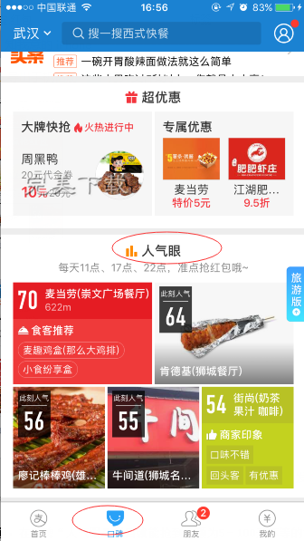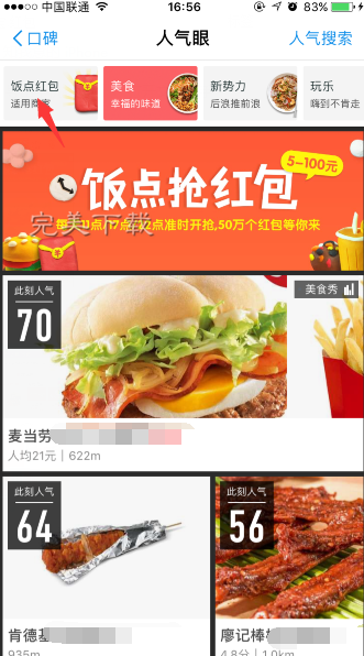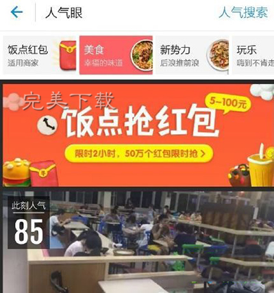 进入支付宝,点击口碑,在进入“人气眼”栏目,就可以通过广告抢支付宝饭点红包。
