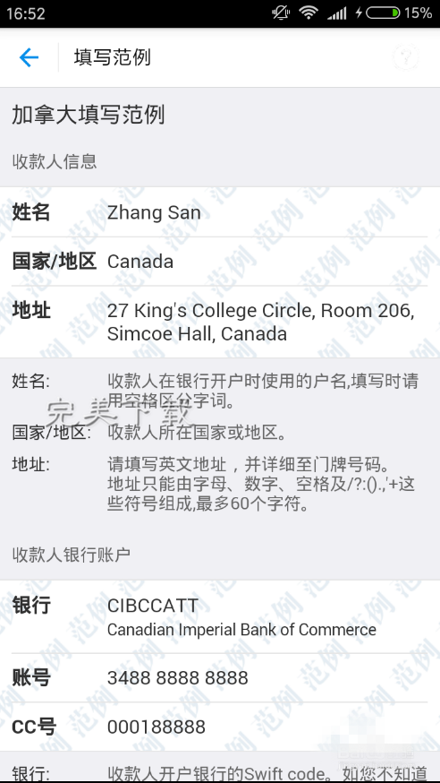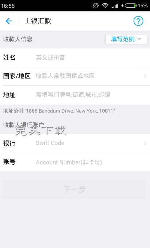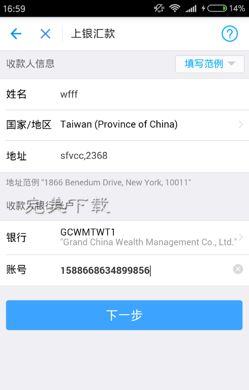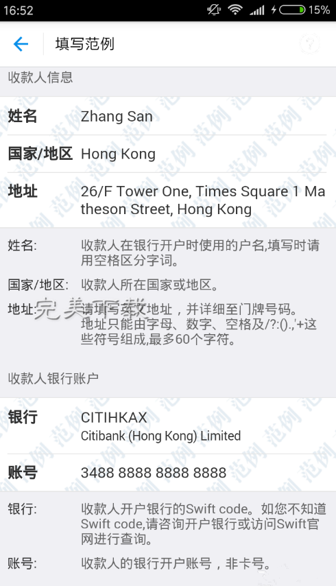 5、输入收款姓名、国家或者地区、以及地址,然后输入银行的swift code和账号,这里的账号并非卡号,所以要特别注意!