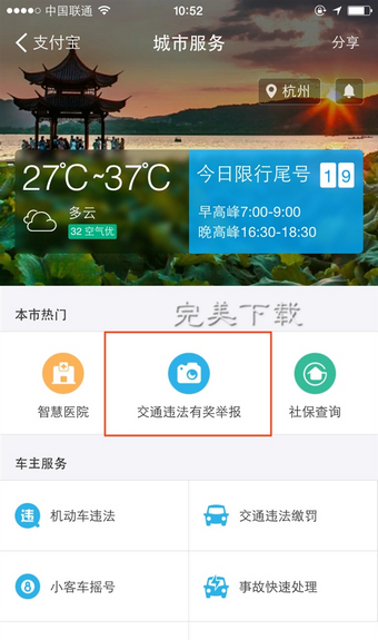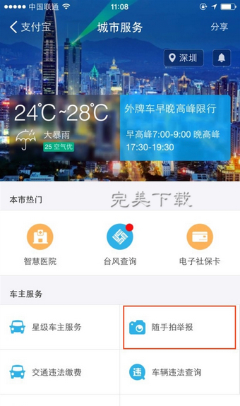 现在开车的人越来越多,交通违法行为也随之增加,乱停车、乱开车的现象屡见不鲜。现在支付宝城市服务里面新增了一个“随手拍”功能,在深圳和杭州地区开通了有奖举报交通违章。下面小编就来教教大家如何使用支付宝举报交通违章功能流程,让那些乱停车、乱开车的司机无所遁形吧。