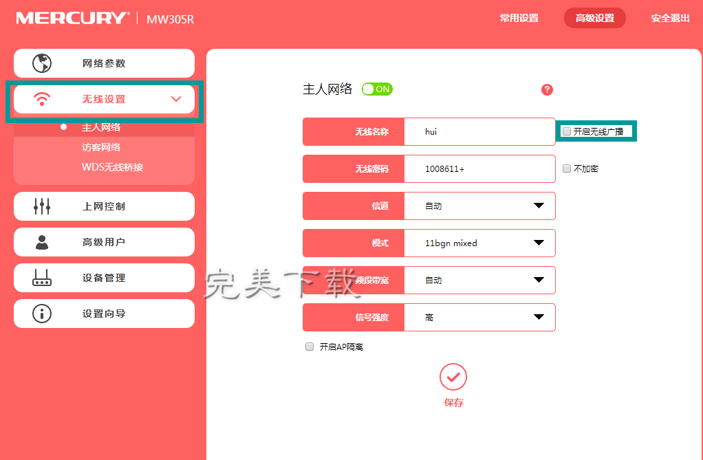 以本人自家用的路由器为例,在管理界面,找到“无线设置”栏目,里面直接就可以看到“无线广播”的开关,取消勾选即可完成需要的操作。