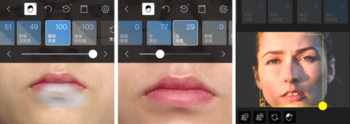 或许是技术局限,对面部器官的捕捉也不太准确。比如,当对嘴唇进行处理时,捕捉区域和真实区域有较大的偏差。另外,当一张没有露牙的照片也可以对牙齿调节时,就有些尴尬了,不过参数调节对画面没有太大影响。
