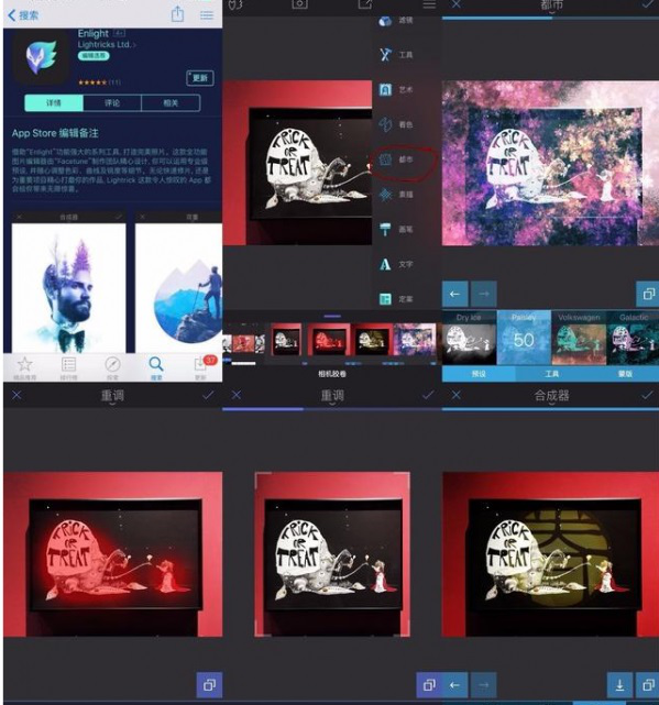 同样作为全能型选手,具体的修图就不介绍了,也是类似的调整参数值,讲几点 在我不用Snapseed时Enlight的吸引点。对我而言,Enlight的艺术模板里的都市,是最大的卖点!感受一下效果图啊。也可以看到Enlight里每一个滤镜也都是可以用蒙版的,有蒙版的APP才是好APP,请牢牢记住这一点。第二个卖点,就是Enlight里的重调功能,你可 以先锁定图片中不需要移动的地方,再进行垂直、水平挤压或者拉升,是不是很炫酷。上图感受一下。第三个卖点么就是双重曝光了,在工具下设的合成器可以完 成,这里就不做详细的介绍了,后面有对双重曝光专门进行介绍,只放图看一下功能。