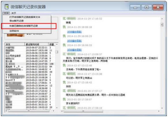 8、此时,我们就可以在软件界面上查看苹果手机微信聊天记录了。但是本文要说明的是苹果手机微信聊天记录删除了怎么恢复的问题,很简单,我们只需要点击下图中的“恢复已删除的微信聊天记录”菜单即可。