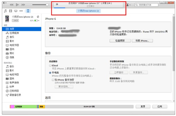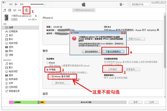 2、在电脑上安装并打开iTunes软件,点击iTunes窗口左上角的iPhone小图标,然后选择“本电脑”并点击“立即备份”按钮。如果弹出窗口询问是否备份应用程序的话,请点击“不备份应用程序”,如果还弹出窗口询问是否对备份数据加密的话,请点击“不加密”。