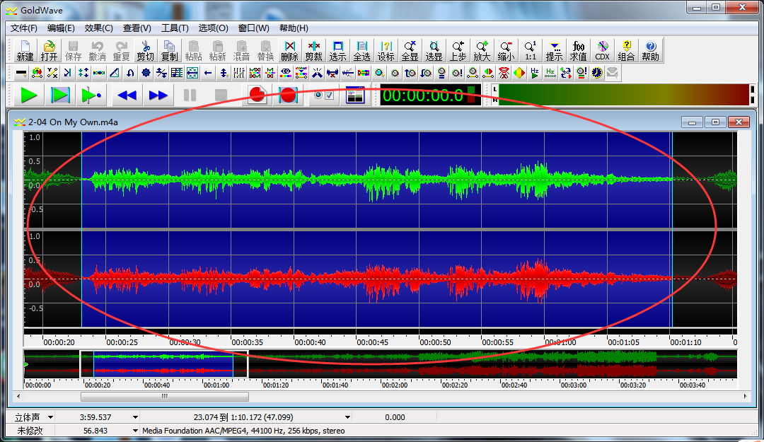 先说一下基本操作。这些键位都可以再选项-键盘里面设置。给大家说几个简单常用的。空格键是开始暂停,H键是播放你鼠标指的地方(英文输入法的时候有效,无效的时候切换下输入法吧~),ctrl+c复制,ctrl+v粘贴,ctrl+x剪切,这些跟windows是一致哒~~~很方便哒~~~鼠标单点击其实是选框,也就是选取了一片区域,不过单击是选择了从单击点到文件最后的区域,拉动鼠标进行选框的时候,如图6就是选框框住这一部分了。