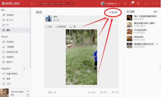 ① 打开网易云音乐APP,点击“朋友”,进入动态页面,这里不仅能发布动态,还能发布短视频