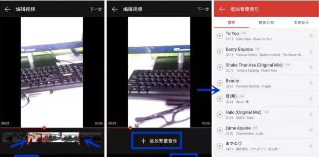 所以就开始编辑视频!里面包括剪辑和添加背景音乐,剪辑就是要留下要上传的视频片段,然后点击右边音符添加背景音乐。(音乐可以是网易云音乐里的推荐,也可以自己手机内已经下载好的音乐。)