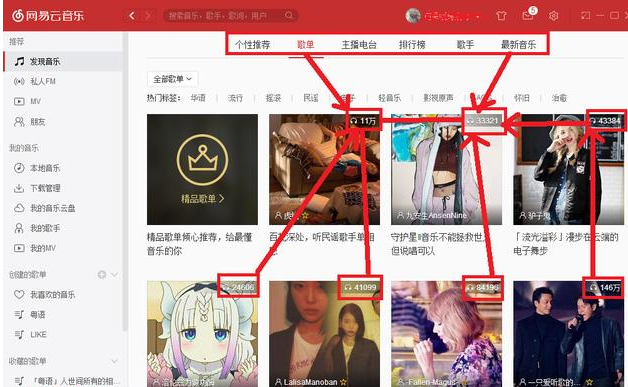 ②设置完资料后,我们找那种播放量高的“歌单”,其实不一定要“歌单”,也可以看哪里板块人多就去哪里。