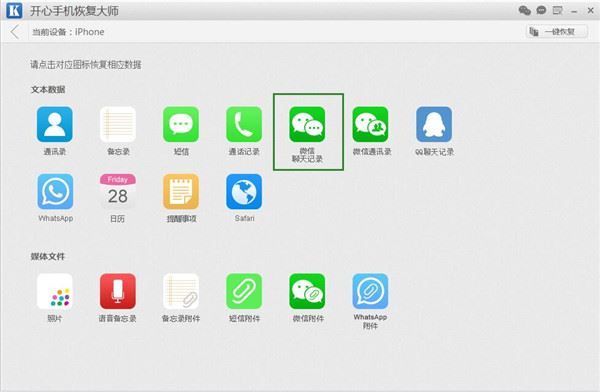 下载开心手机恢复大师软件,手机连接到电脑上,点击【微信聊天记录】,进入界面之后,默认是全选的情况下,直接点击【恢复到电脑】将全部微信聊天记录备份到电脑本地。