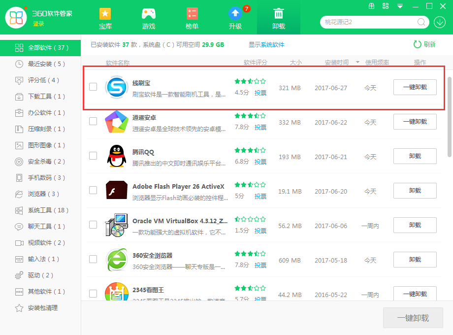 2、然后在管家的“卸载”界面中找到“线刷宝”,之后点击“卸载”并根据提示操作即可将其卸载。