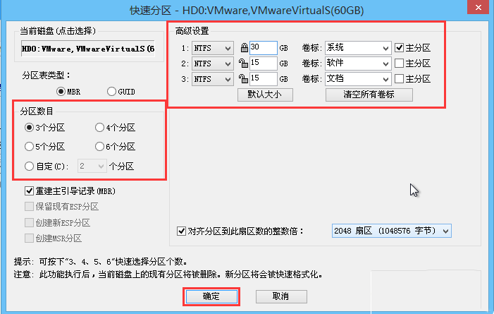 在弹出的的快速分区界面,左侧可以设置分区数目,右侧设置分区属性,分配的大小可以根据自己需求来设定,设置完就可以点击确定就开始分区了,如下图所示: