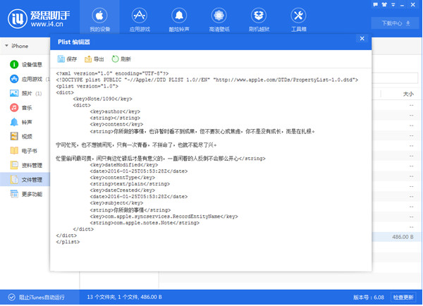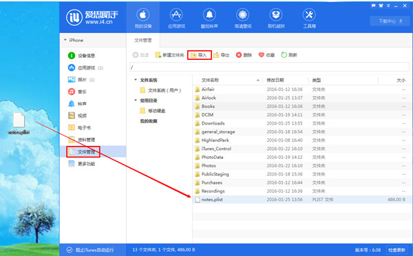 3、把notes.plist拖进到爱思助手“文件”里面。