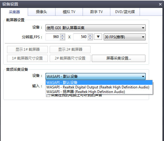 在PotPlayer播放窗口右击,选择“打开→设备设置”,切换到“采集器”选项卡,在“音频采集设备”的“设备”列表中选择麦克风设备。如果不想录制声音,忽略即可。