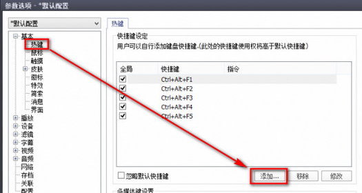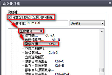 同样在播放窗口中右击,选择“选项”,在弹出的设置窗口中选择“基本”下的“热键”。然后点击右侧窗口中的“添加”,选中“任意窗口焦点都可控制”选项。现在在“快捷键”列表中,根据需要设置操作的快捷键命令,我这里设置的是小键盘的Del键。然后在命令列表中,依次选择展开并选择“视频→图像截取→录制视频”命令,最后点击“确定”退出。