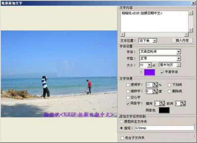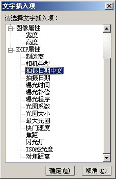 在这里,你可以选择当前位置要插入的文字内容,比如文件属性、图象属性和EXIF属性,其中EXIF信息的强大信息记录可以帮助你自动完成大量的工作,将拍照时的时间、光圈、焦距等信息读取出来,自动完成的文字添加。