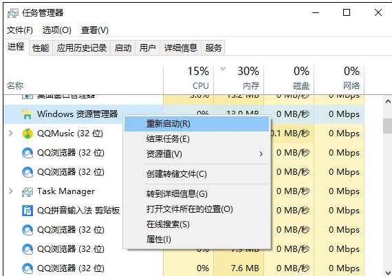 4、在开始栏右击或按Ctrl+Alt+Delete打开任务管理器,右键“Windows 资源管理器”→“重新启动”。