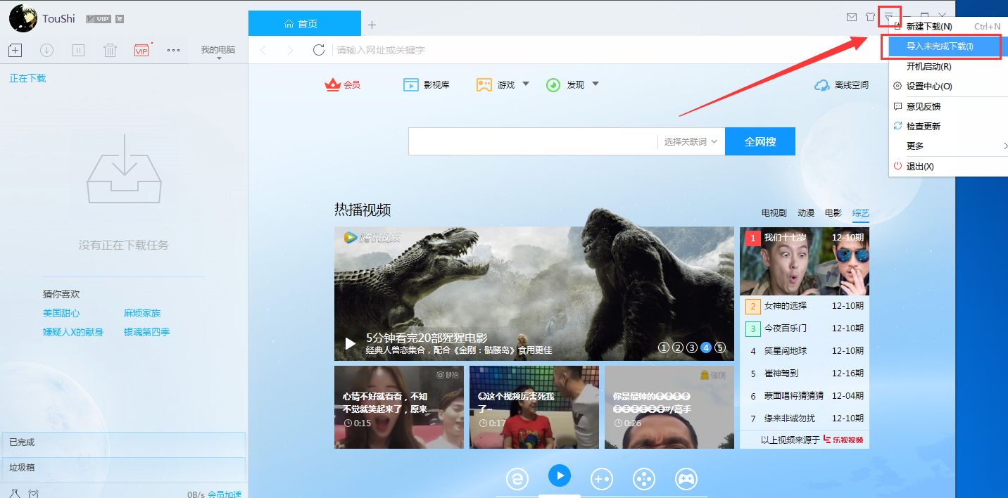 2、接着我们在迅雷9主界面的右上角找到一个倒三角的按钮,打开它在里边的选项中选择“导入未完成下载”;