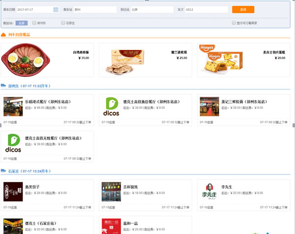 在页面输入乘车日期、乘车站、到达站以及车次之后,即可搜索到相关餐食。