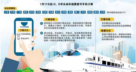 高铁的开通方便了人们的日常出行,也给我们外地出差、旅游时选择交通工具提供了另一种选择。有些小伙伴不习惯高铁餐,没关系,从7月17日起,动车组列车可在网上订餐啦,乘坐G、D字头的动车组列车出行的旅客,可以通过12306网站、手机APP等方式预订所乘列车餐车供应的餐食,也可预订沿途供餐站供应的社会品牌餐食。