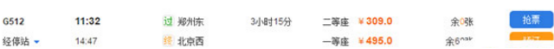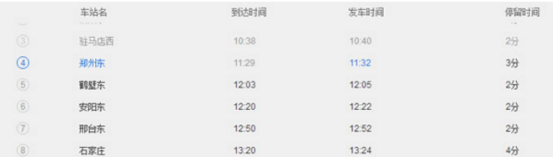 笔者这里以途经郑州东站终到北京西站的G512次车为例,11点32分郑州东开车,14点47分到达北京西,途经鹤壁东、安阳东、邢台东、石家庄、定州东。