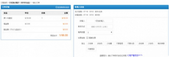 选择餐食之后,车次信息已经默认为开始选择的车次,用户需要填写收餐人姓名和电话,并输入需要的餐具数量,当然发票也是可选的,同时备注中还非常人性的有“多放肉”、“少放醋”等现成的选项可供选择。