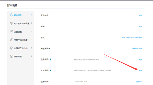 2、进入账号设置后,我们找到如图所示的支付密码一栏,看到后方有一个支付密码重置选项如图,点击。