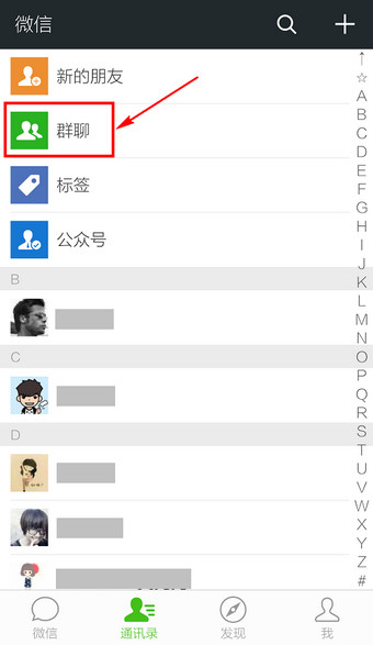 4、进入通讯录,点击【群聊】