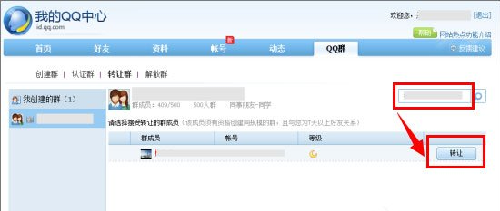 3、这时进入我的QQ中心页面,在右上角的搜索栏中输入想要把群转让给的QQ好友昵称或者QQ号码,这时候在群成员中将可以看到该好友的信息,鼠标移到该QQ列表上,将有一个“转让按钮”浮现出来,点击它;