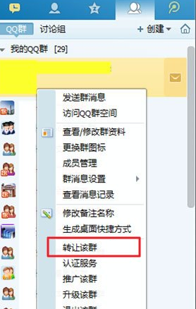 1、登陆打开需要转群的QQ,切换到群栏目,找到想要转让的群,右键单击选中“转让该群”;