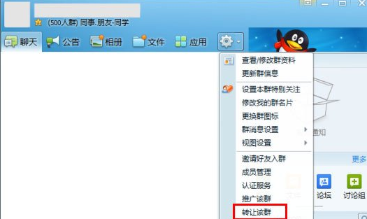 2、或者双击打开想要转让的Q群,进入群聊窗口,点击右上方设置按钮的下拉符号,选中“转让该群”;
