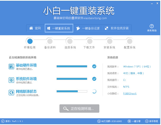 首先打开小白一键重装系统,主界面上部则是软件名以及宣传口号,一句“最简单好用的重装软件”恰当地表达了小白软件的作用之强大、实用性之通广,接下来就是一排功能按钮,包括官网、一键重装、一键备份还原、软件在线安装等排开,软件打开默认是一键重装系统界面,这也是它最核心的功能,底部分别显示版本号、官方技术Q群(协助用户解决使用遇到的故障)、分享按钮、新手教程等,布局简洁利落,中间白底色调占据软件整体面积,点击“立即重装系统”进入自动检测系统环境界面。