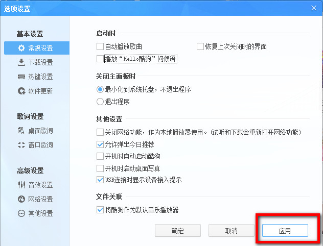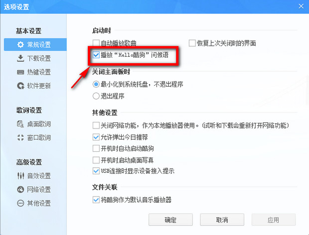 2、进入设置界面后,在常规设置里将“播放‘Helllo酷狗’问候语”列项的勾选去掉,点击应用。(确定是无法保存的)