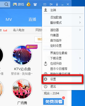 如图在酷狗播放器的右上角的主菜单,在主菜单的下拉列表中点击进入“设置”。
