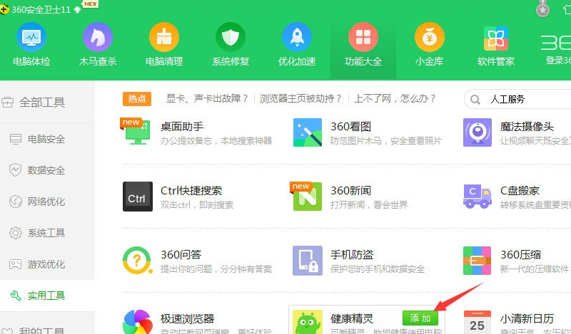 2、在打开的工具选项里找到“健康精灵”,将鼠标移动到健康精灵上去,然后点击出现的“添加”,如下图所示。